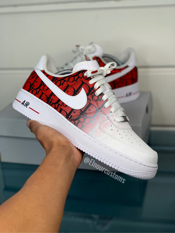 Custom Bloody(Red) Dior Air Force 1. Dior is popular brand with some amazing designs. We decided to do a little twist with these customs by have the red and white gradient effect and black and white Dior print. Hand painted by @Elnourcustoms. Every shoe is painted with the highest quality of leather paint and covered in a scratch resistance sealer that can withstand some of the harshest conditions.