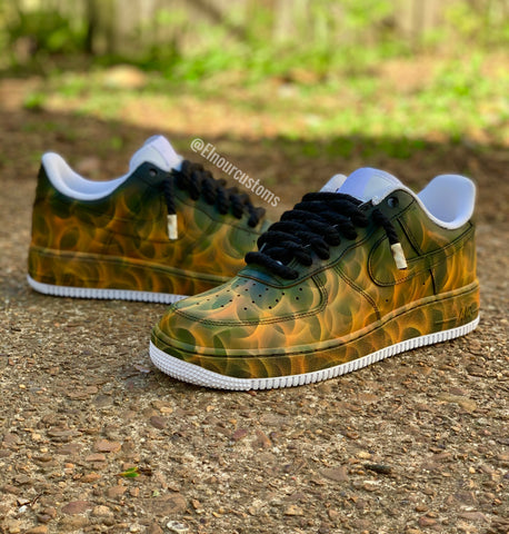 Keep the flame close to you by having it on your feet. Walk around in fire customs. Hand painted by @Elnourcustoms. Every shoe is painted with the highest quality of leather paint and covered in a scratch resistance sealer that can withstand some of the harshest conditions.
